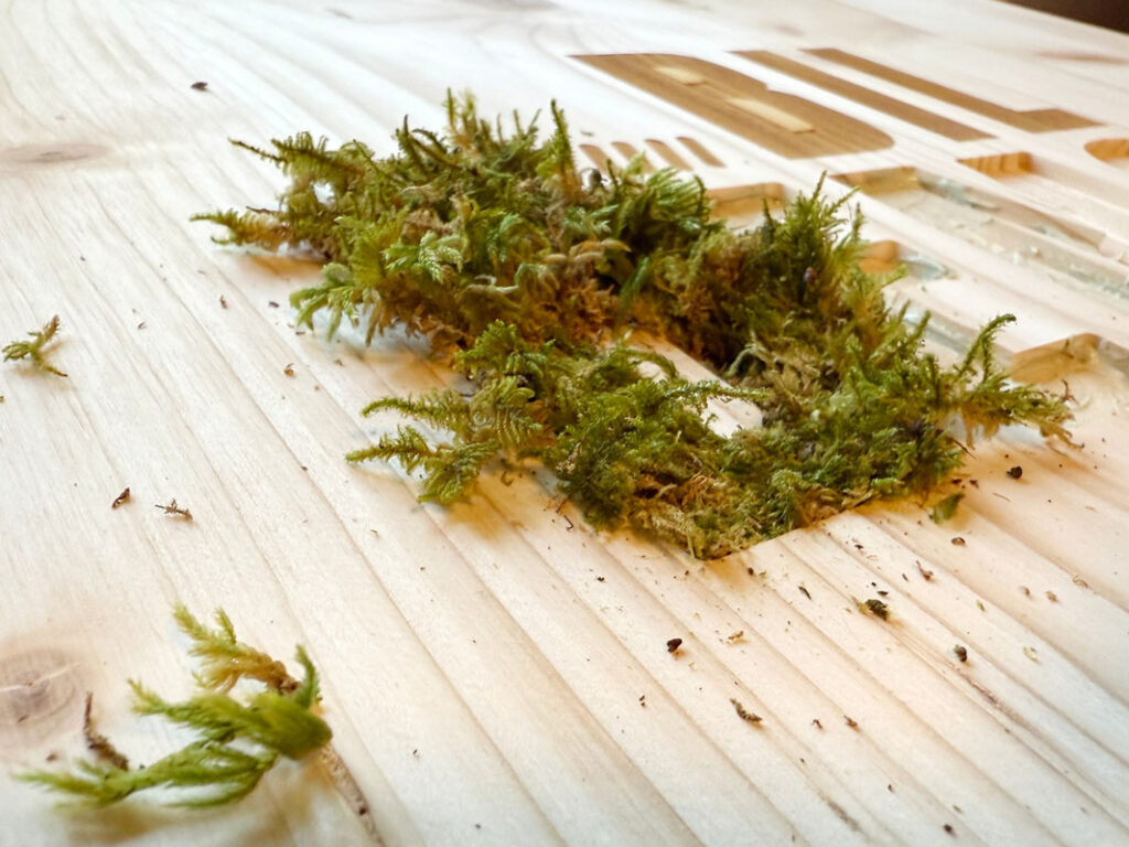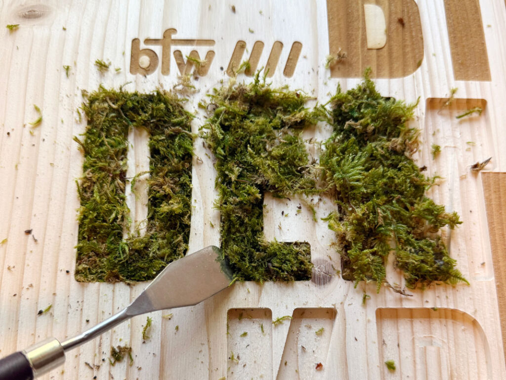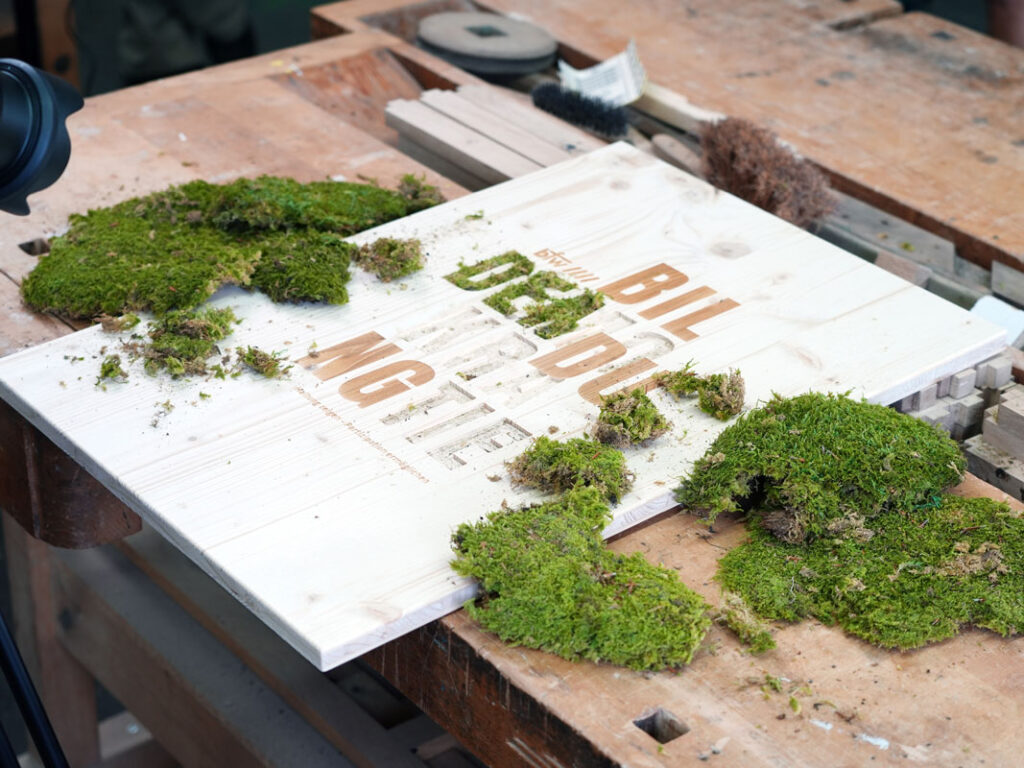 Der Titel des diesjährigen Geschäftsberichts wurde am Tag der Demokratie als Moosboard gefertigt und aufgestellt. Nun ist es an den Mitarbeitenden und Teilnehmenden, das Moos zu pflegen, damit es weiterhin wächst.